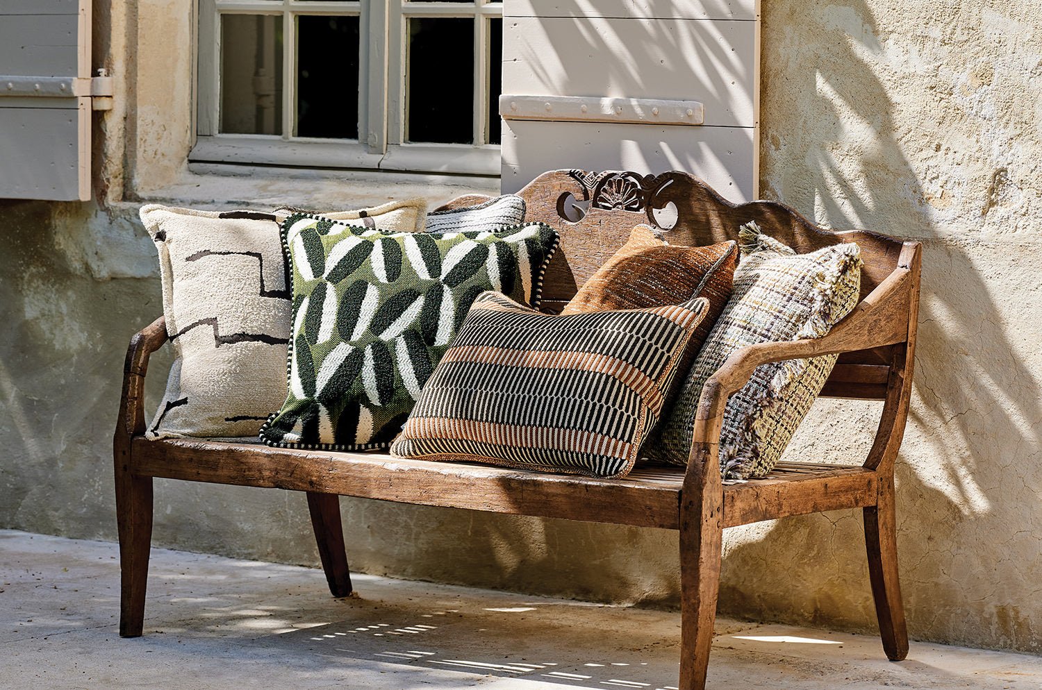 質感と色彩のコントラストが際立つ「Timor Outdoor」クッション。触感豊かなブークレ糸で抽象的なオーバル(楕円)モチーフを表現し、仕上げにコントラストの効いたストライプパイピングを添えて、表情をいっそう引き締めています。
