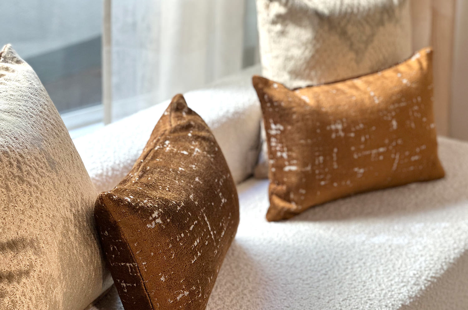 コットンとリネン混のテキスタイルは、柔らかな手触りと陰影の出来る美しいブロンズの色合いが特徴です。