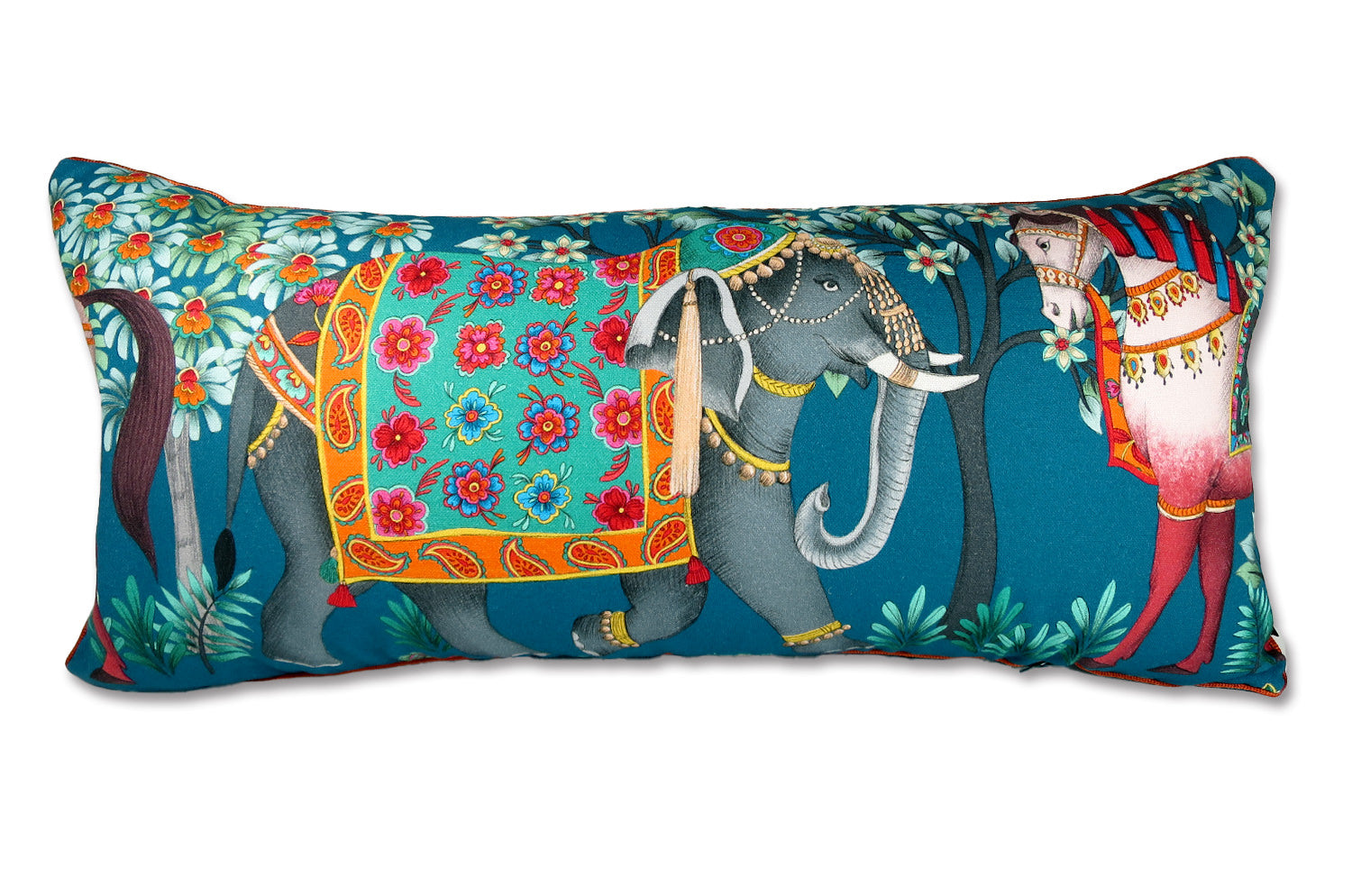 馬や象の背中を覆う毛布や彼らが歩く草木のカラーには、燃えるような赤とミントグリーンで描かれており、その対比がとても美しく華やかです。