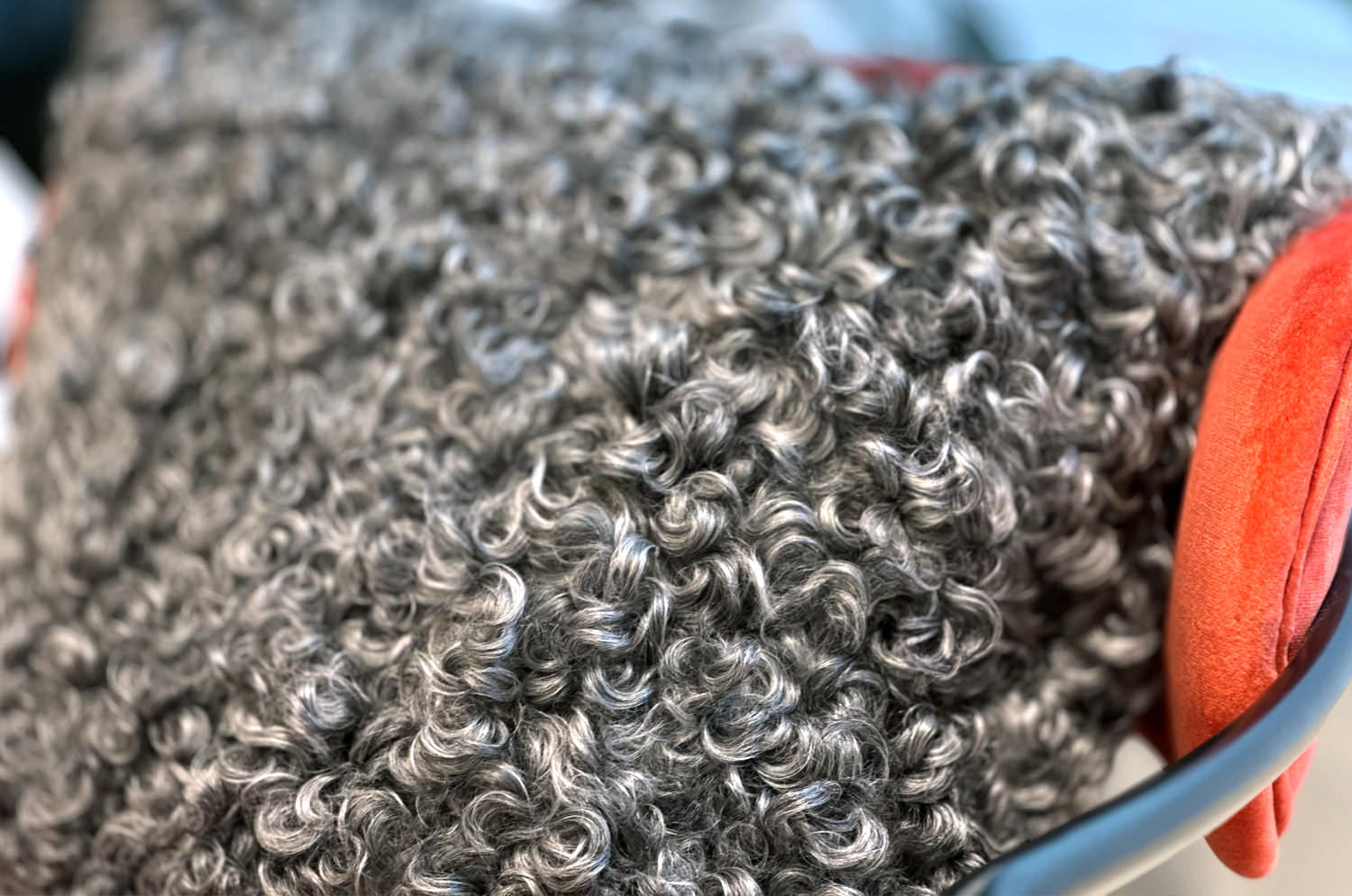 ゴットランドシープの魅力は、ほかの羊毛にはない天然のくるくるとした巻き毛と、シルクのようにしっとりとした肌触り。さらに、輝くシルキーグレーカラーは一切染色を施していないため、世界に二つと同じものが存在しない、まさに唯一無二のシープスキンです。