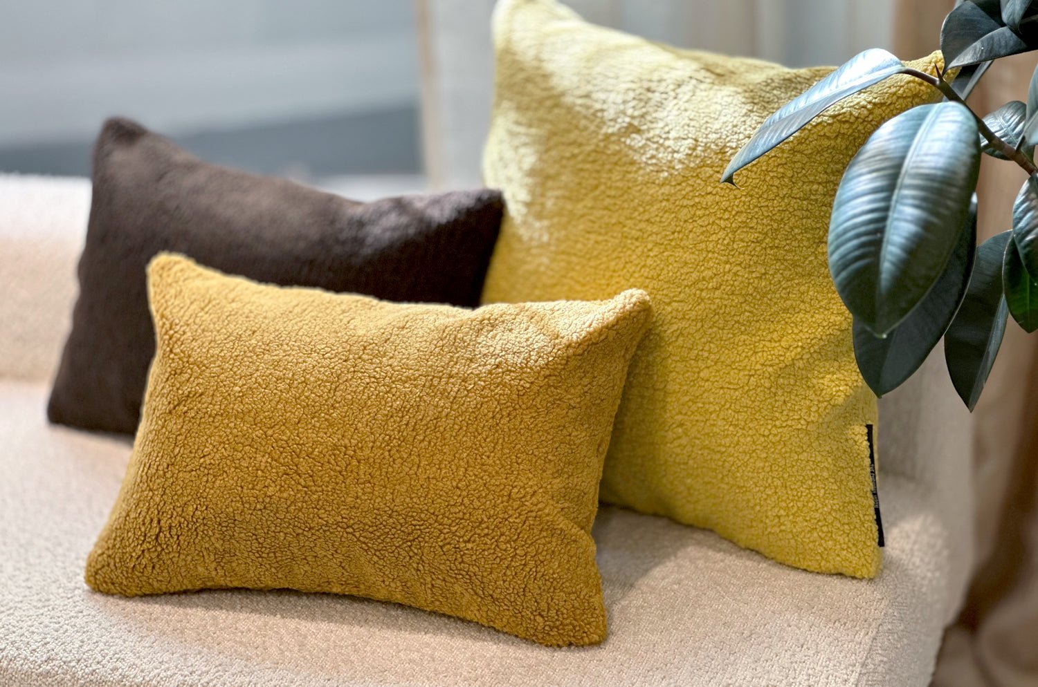 ハニーカラーのふんわりと包み込まれるような、極上の肌触りが魅力のラグジュアリーな横長のクッション。