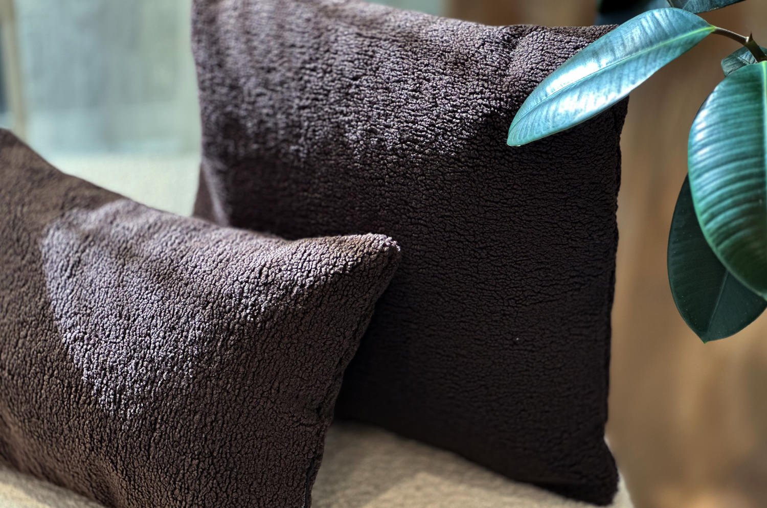 セーブルカラーのふんわりと包み込まれるような、極上の肌触りが魅力のラグジュアリーな横長クッション。