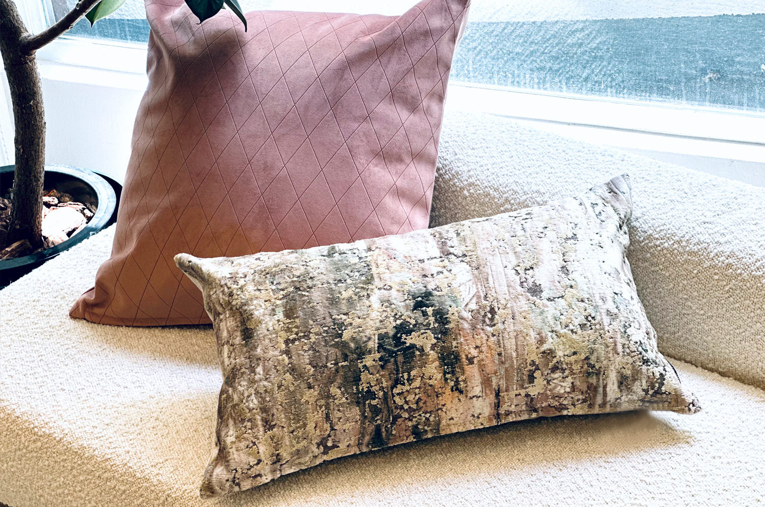 Rebeccaは、ベルベットのような極上の滑らかな手触りとベージュ美しい色彩が魅力の横長クッションです。