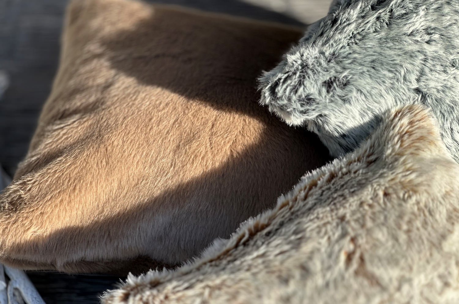 キャラメルのような甘いビジュアルのスノートップのエコファークッションはしっとりと艶めき、空間をグレードアップしてくれます。何よりも、本物のファー以上の肌触りのよさと微妙な色合い、毛並みの滑らかさはラグジュアリーな空間をよりグレードアップさせてくれます。寛ぎの時間にずっと抱えたくなるクッションです。