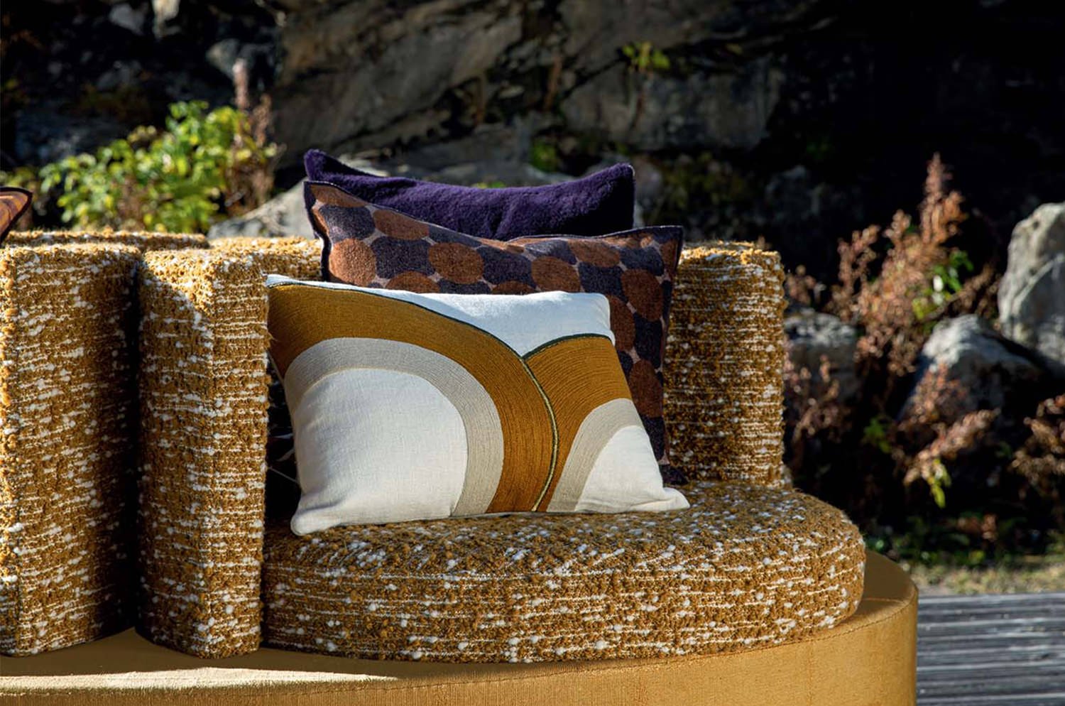 「Bridge」は、リネンのチェーンステッチで大きな同心円状のアーチを描き、躍動感のある幾何学的なテクスチャーを生み出したクッションカバーです。裏面は、無地のやわらかなウォッシュドリネン仕上げ。