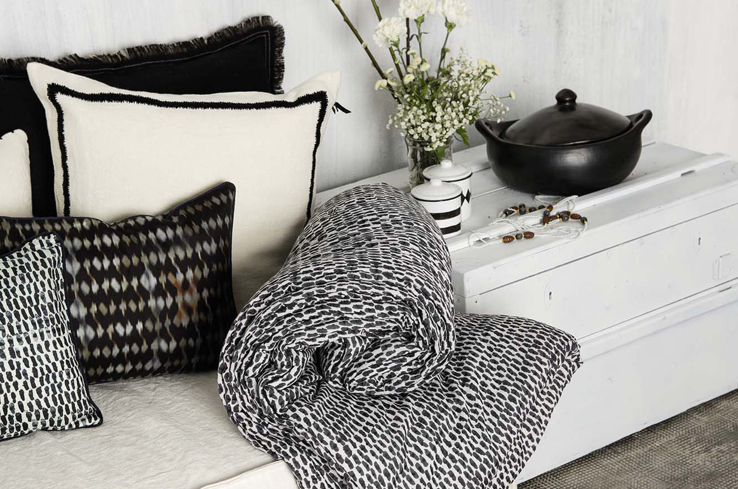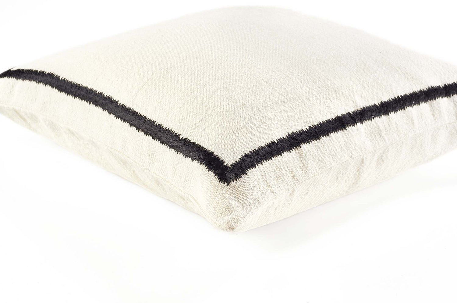 ストーンウォッシュ加工を施したリネンに刺繍をあしらったクッションカバーです。ウォッシュドコットンの薄手生地で裏打ちし、ファスナーは見えない仕様(コンシールファスナー)になっています。