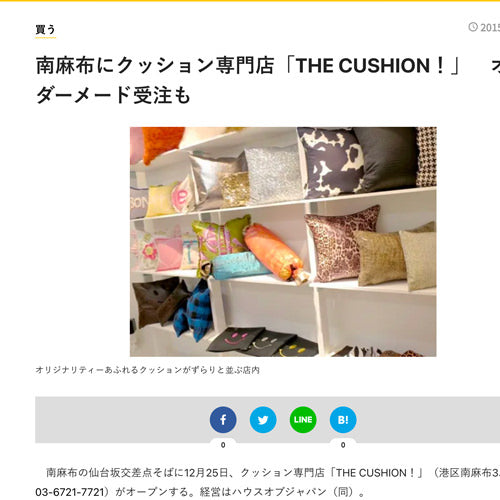 2015年12月22日の「六本木経済新聞」にてハウスオブジャパン運営クッション専門店「THE CUSHION JAPAN(ザ クッション ジャパン)」が紹介されました。